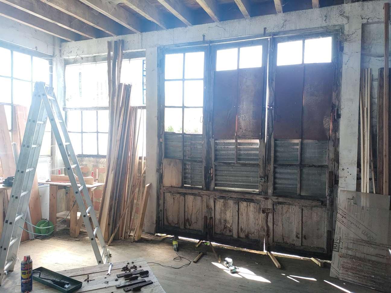 Porte sur trois battants double vitrage en châtaignier massif. Récupération de la quincaillerie d’origine