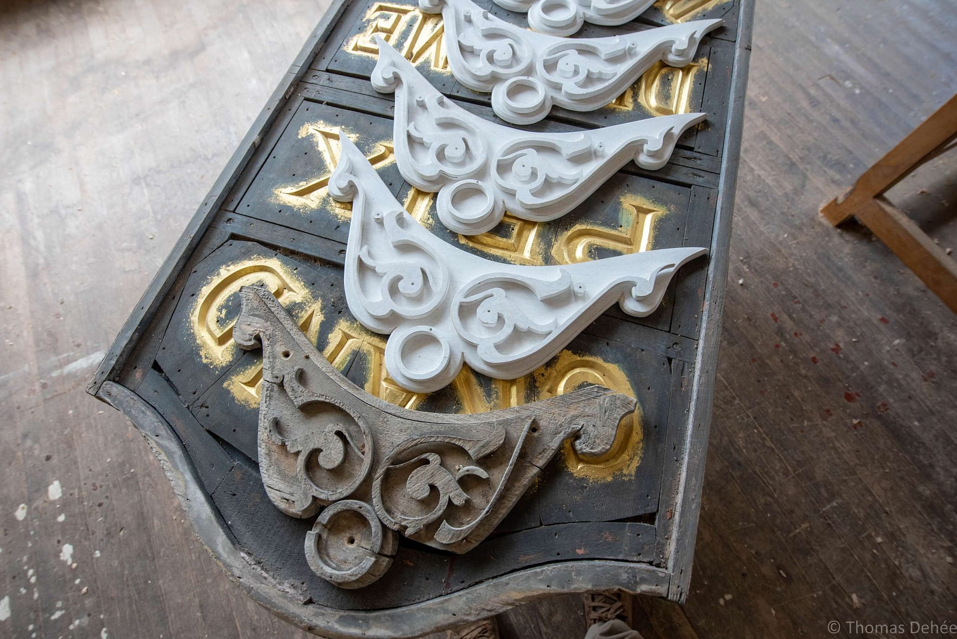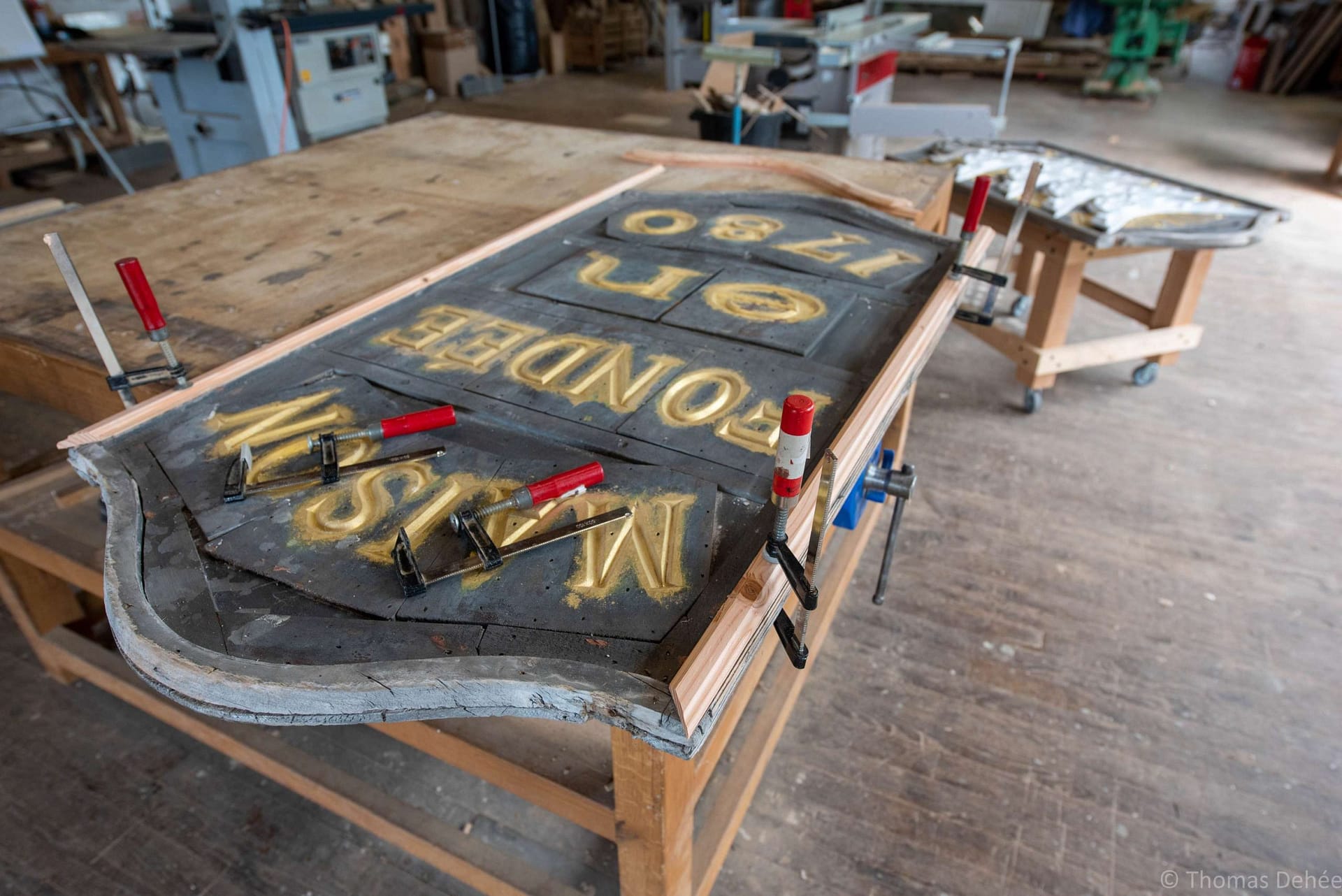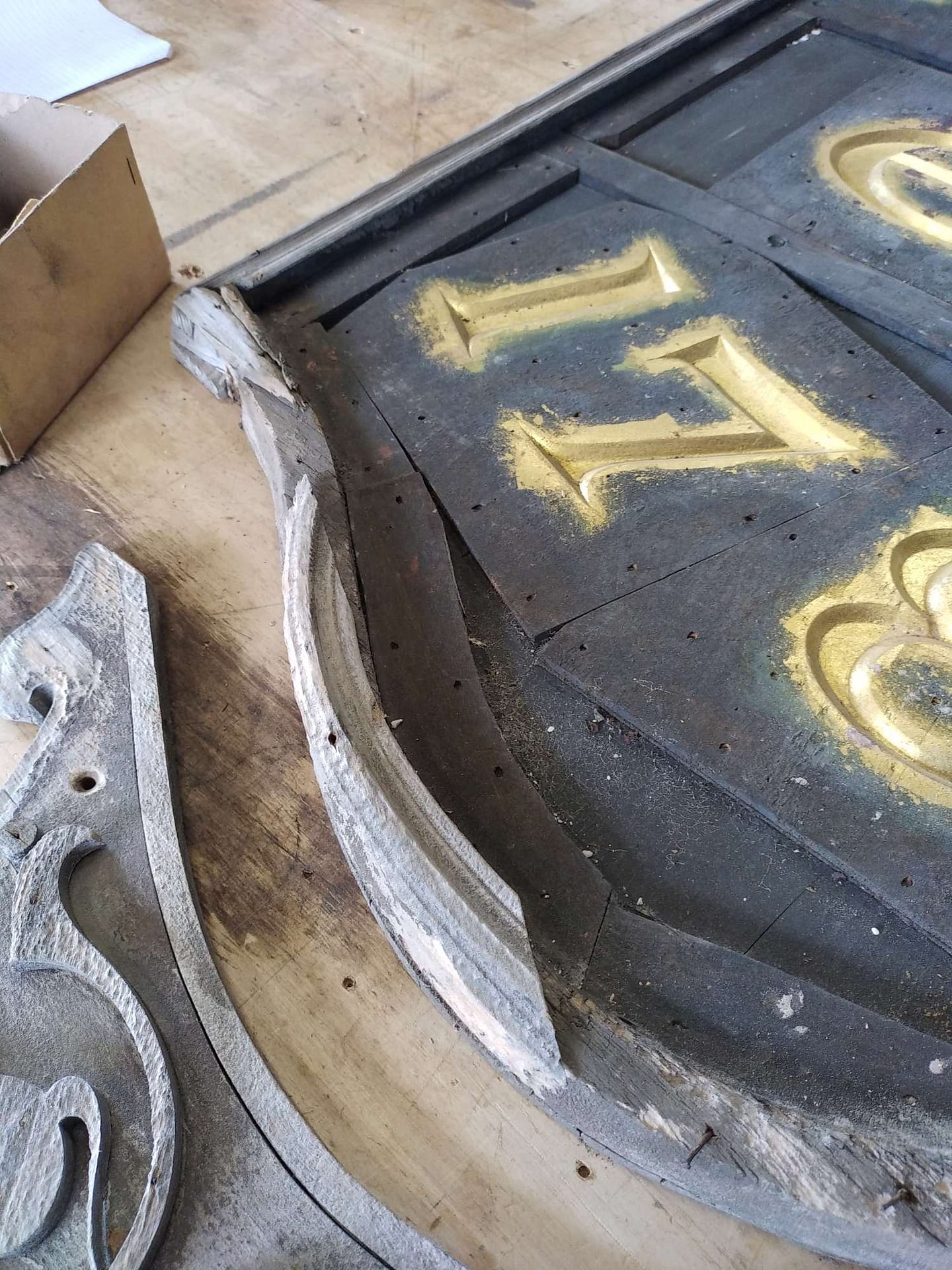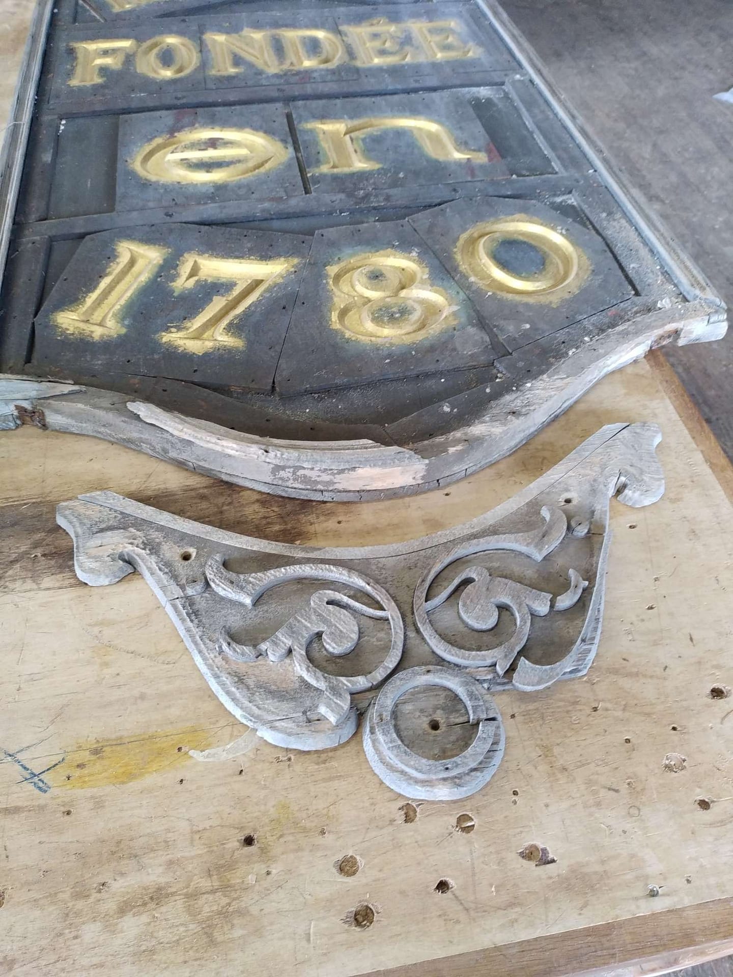 Restauration de deux enseignes de magasin en bois classée aux bâtiments historiques. Restauration avant mise en peinture par le peintre.