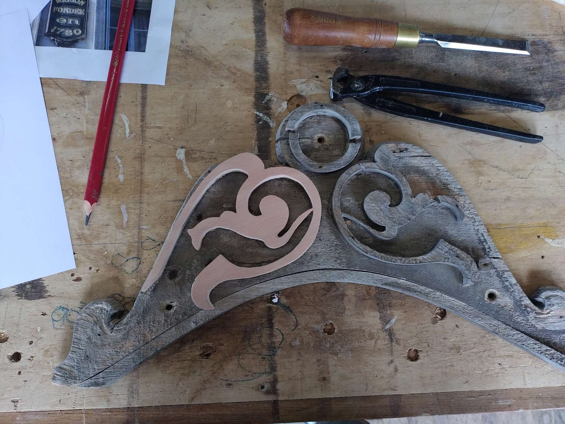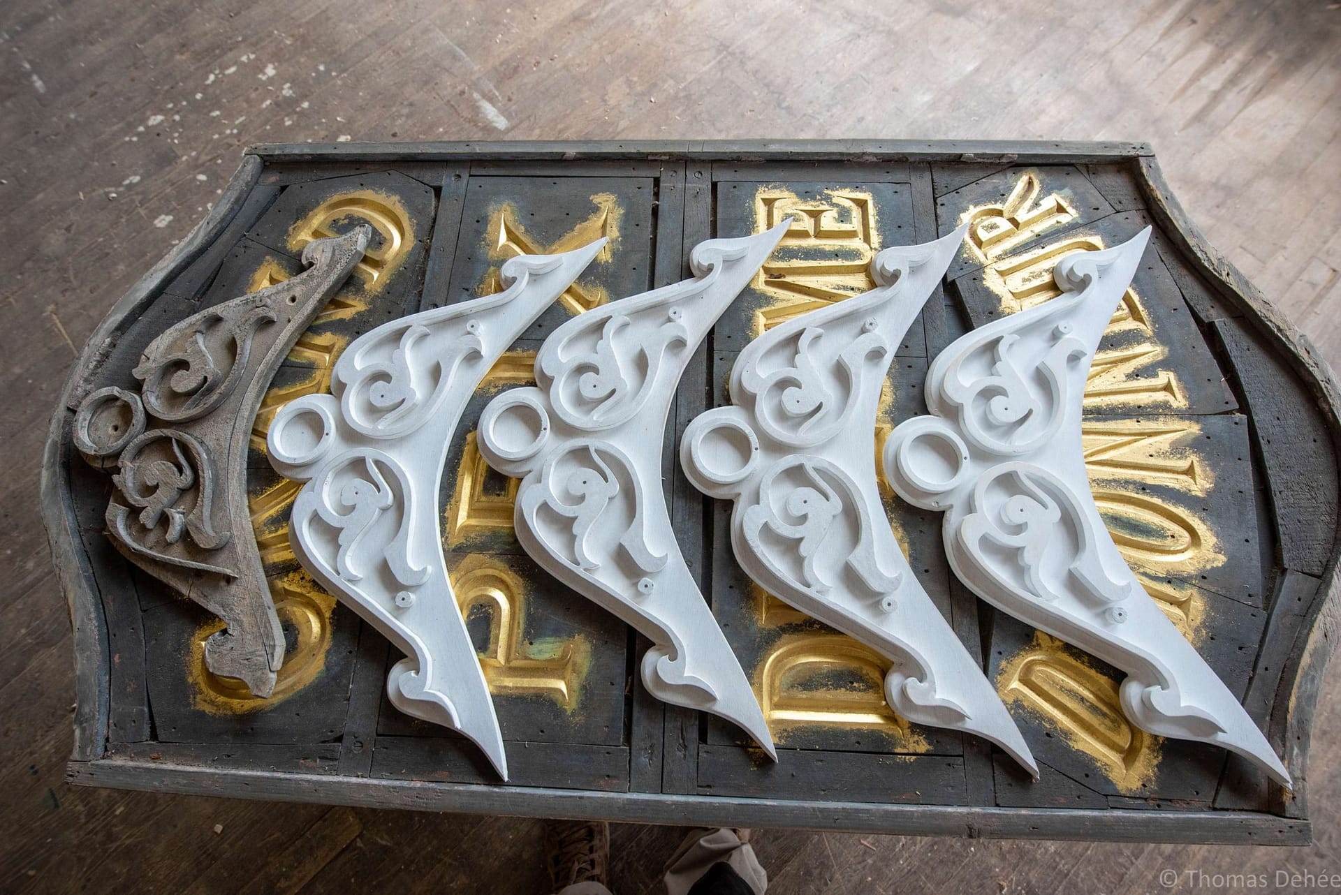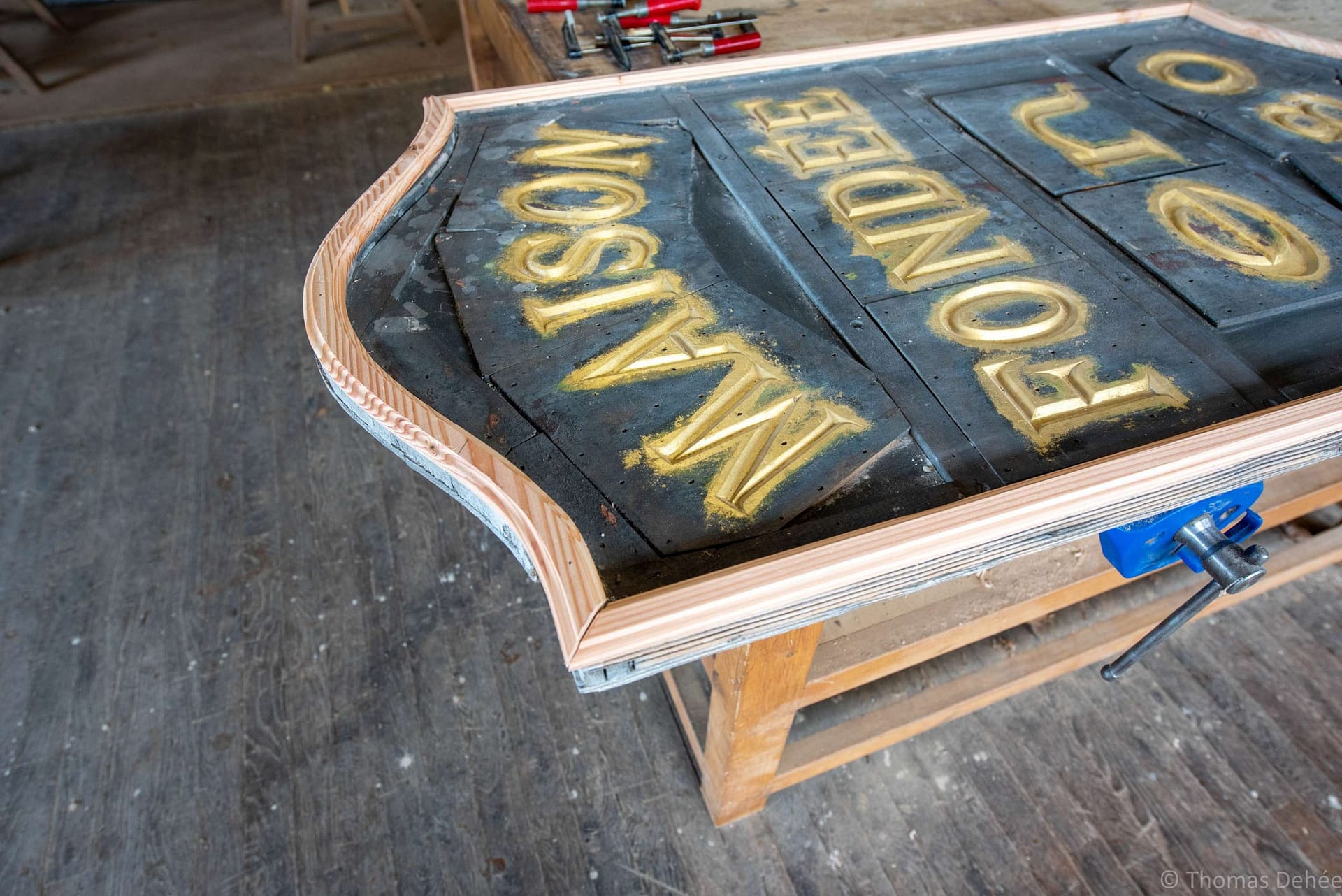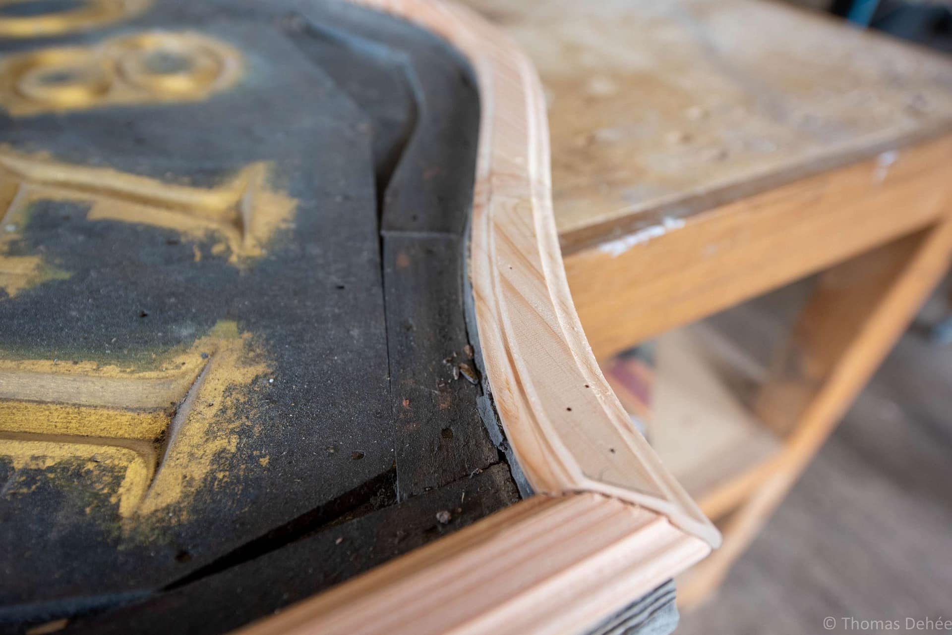 Restauration de deux enseignes de magasin en bois classée aux bâtiments historiques. Restauration avant mise en peinture par le peintre.