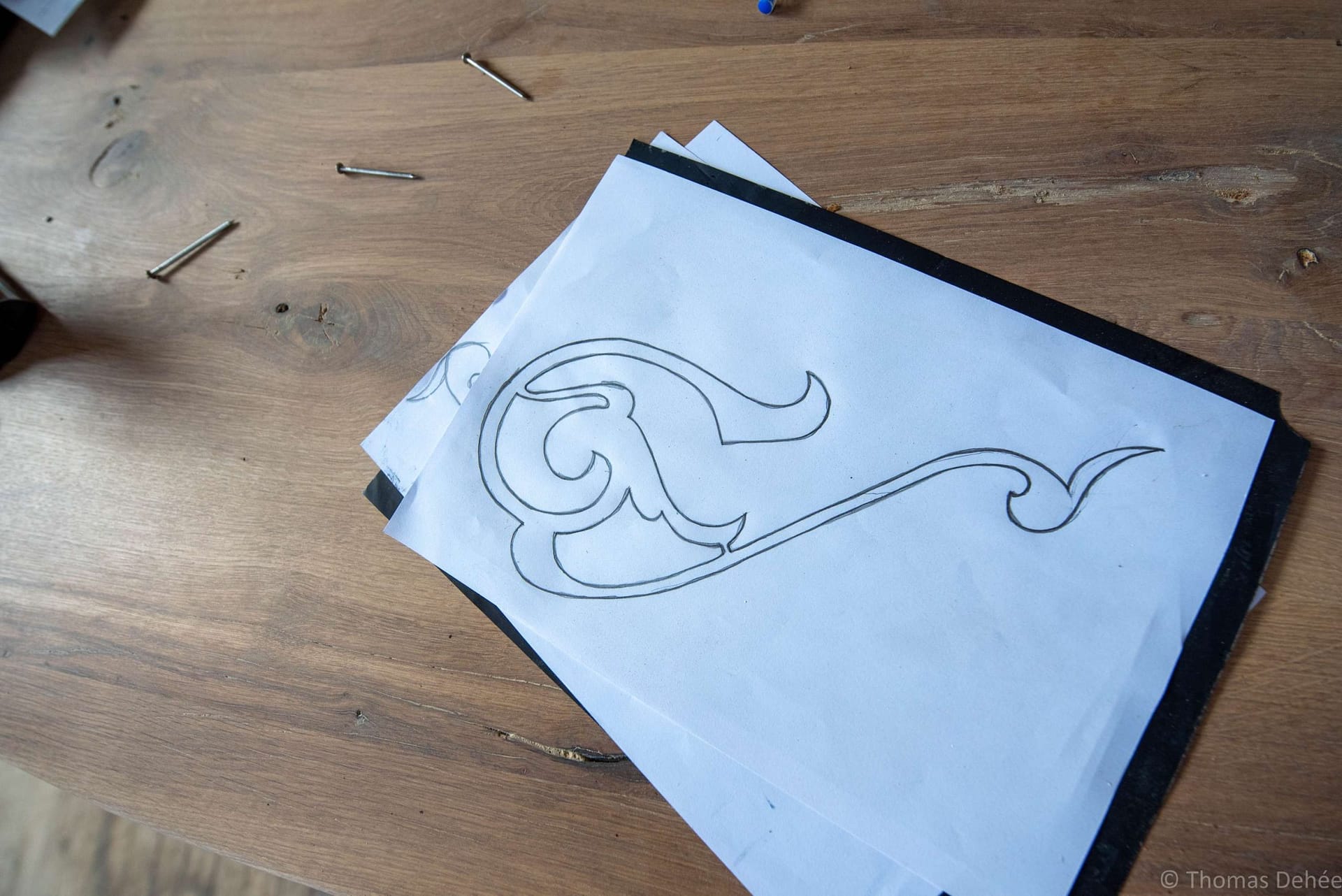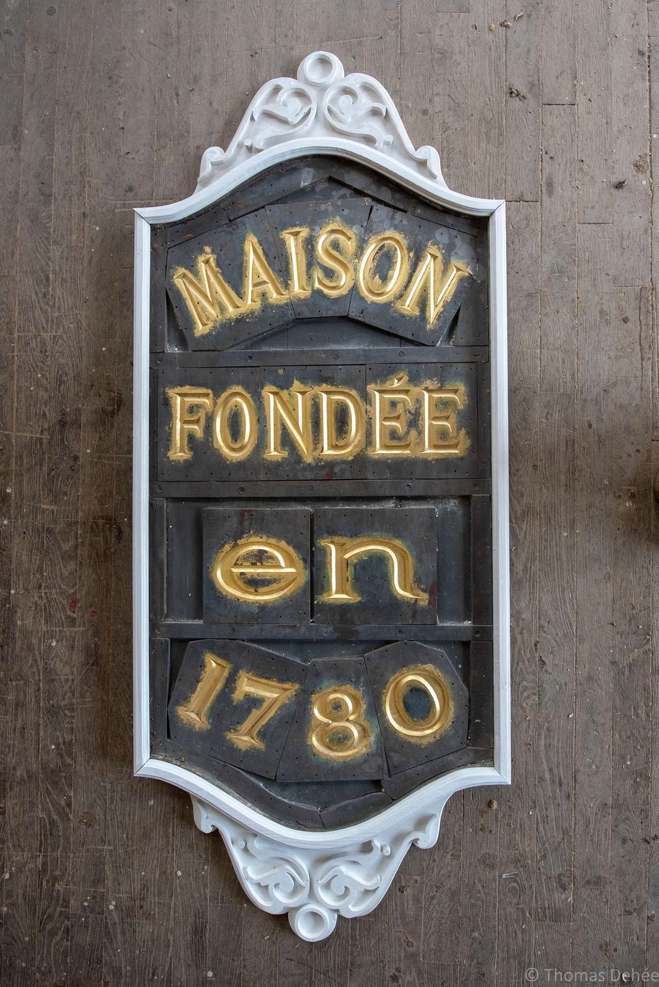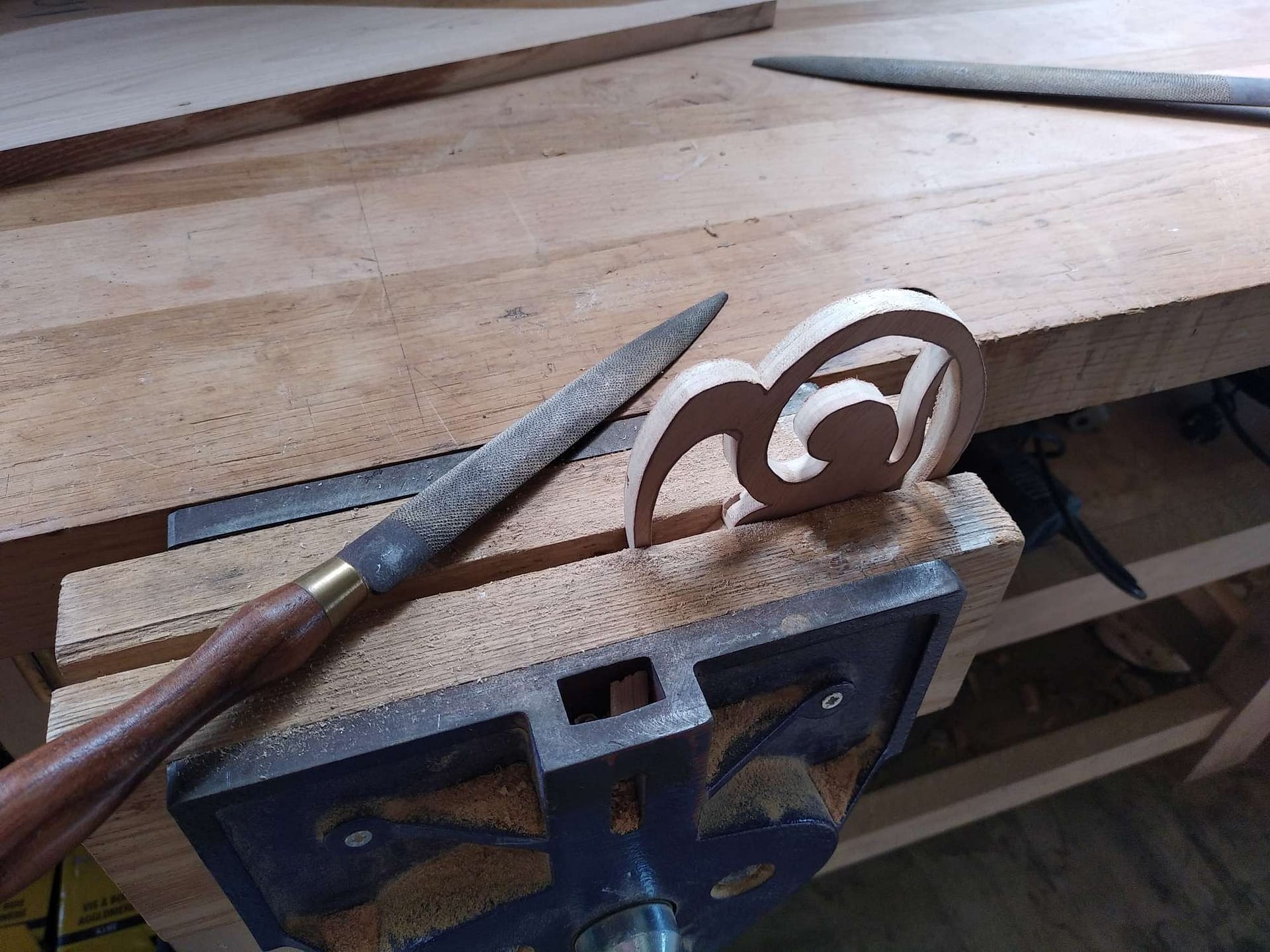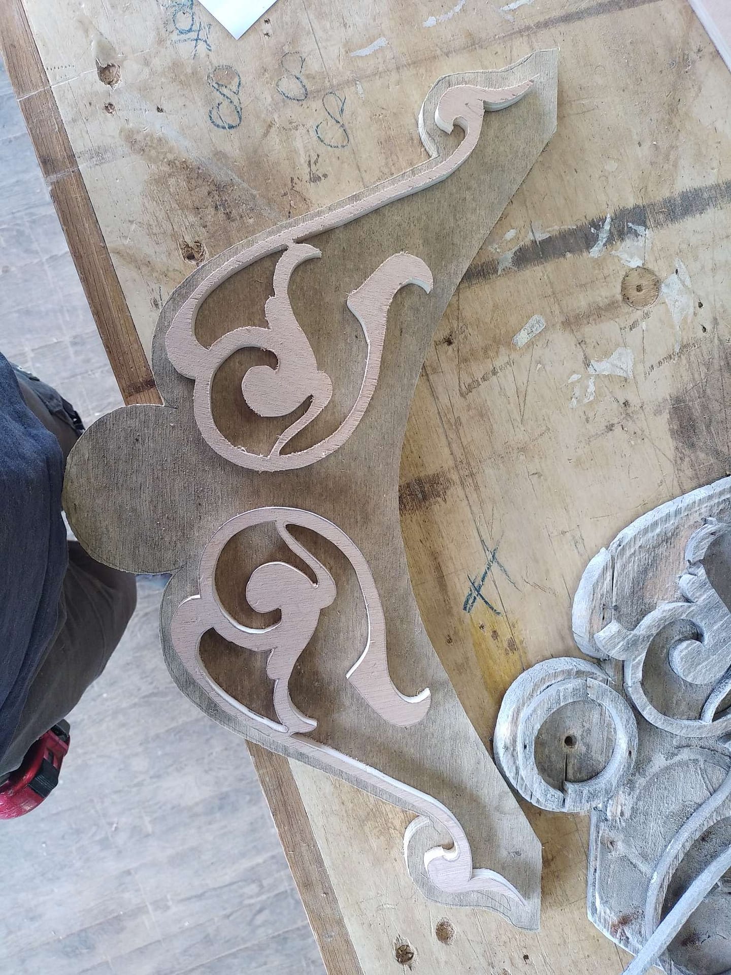Restauration de deux enseignes de magasin en bois classée aux bâtiments historiques. Restauration avant mise en peinture par le peintre.