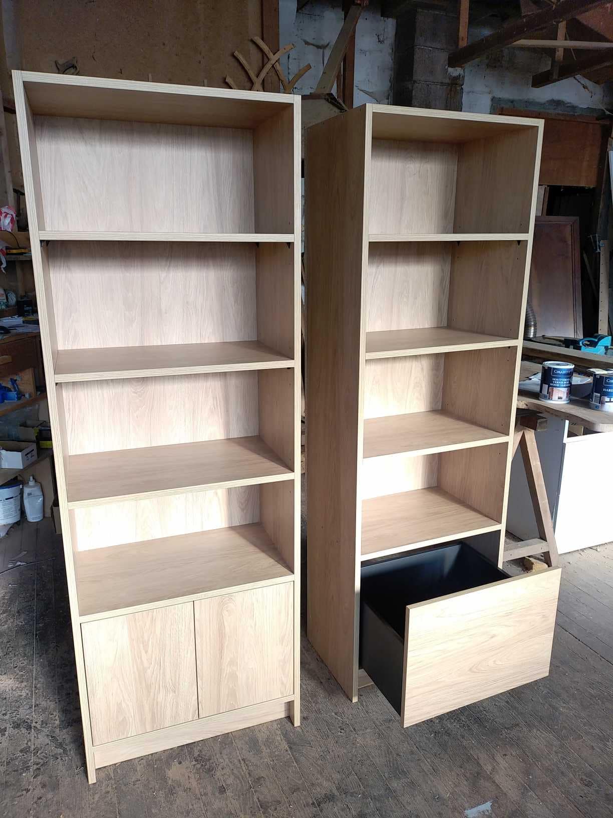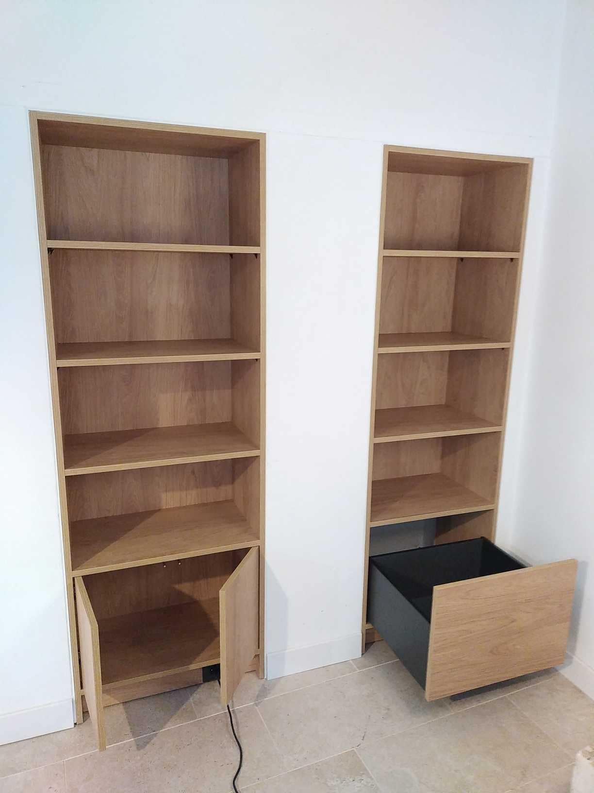 Deux meubles bibliothèque sur mesure en stratifié chêne incorporé dans des « niches »