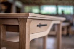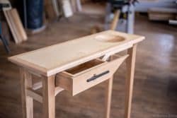 Prototype d’un meuble console d’entrée avec tiroir sur coulisse bois, plateau en plaquage avec vide poche, pieds gainée et traverse courbe.