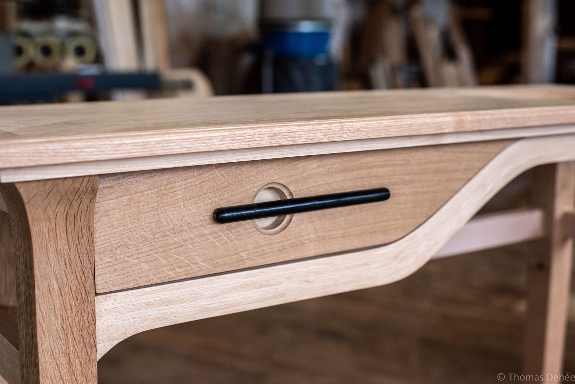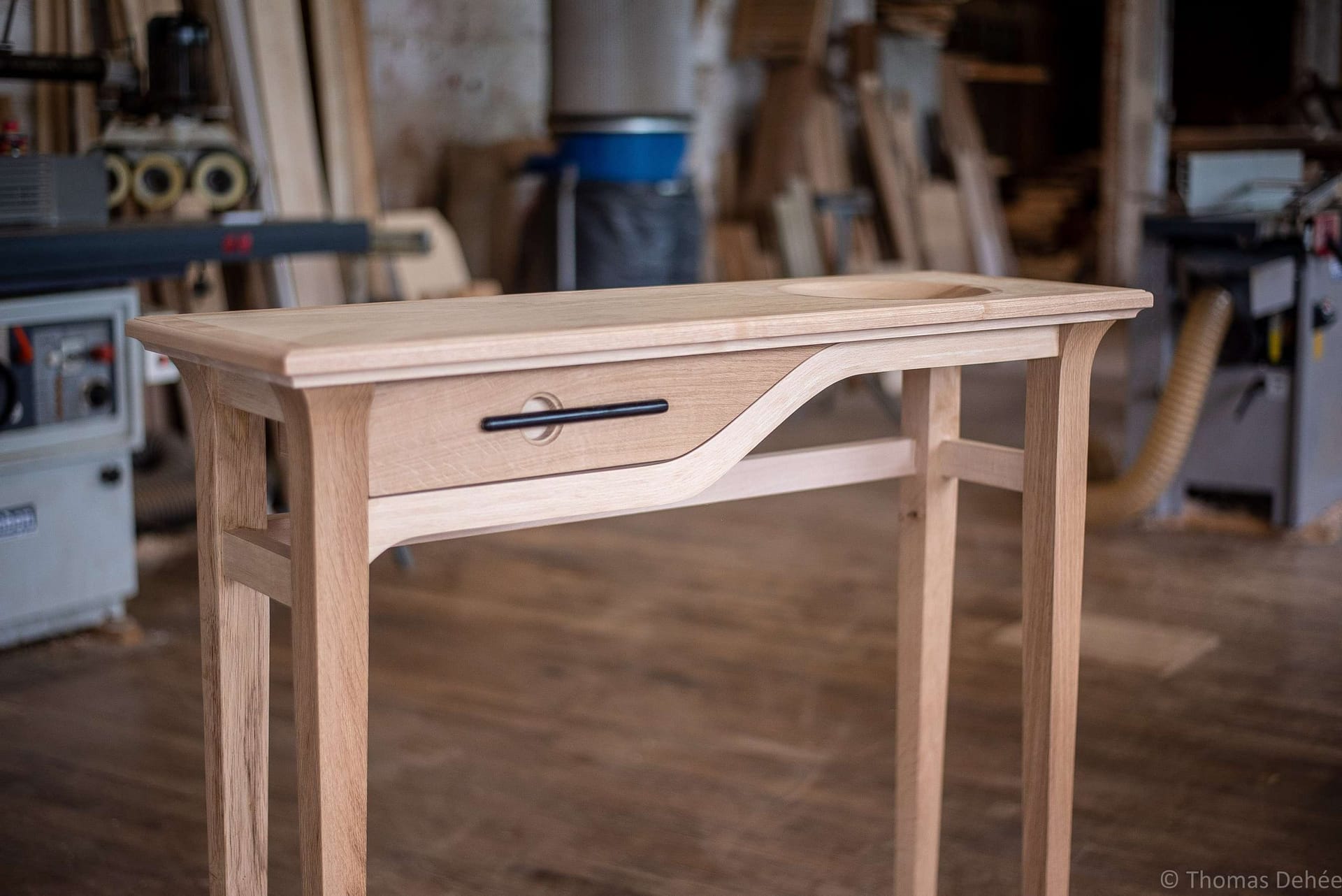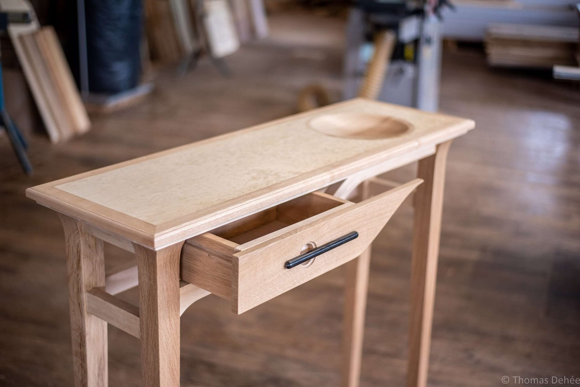 Prototype d’un meuble console d’entrée avec tiroir sur coulisse bois, plateau en plaquage avec vide poche, pieds gainée et traverse courbe.