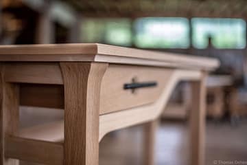 Prototype d’un meuble console d’entrée avec tiroir sur coulisse bois, plateau en plaquage avec vide poche, pieds gainée et traverse courbe. Prototype réalisé dans le cadre de la préparation de la prochaine formation disponible à l’atelier : 6 semaines pour préparer le CAP ébéniste.