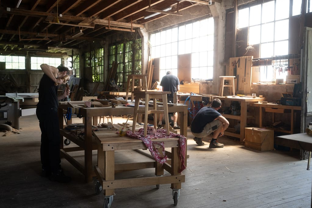 - Début de la fabrication d’un tabouret : travail à la main pour une meilleure maîtrise des gestes.
