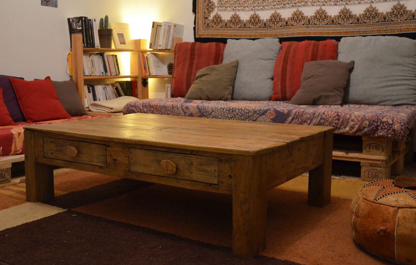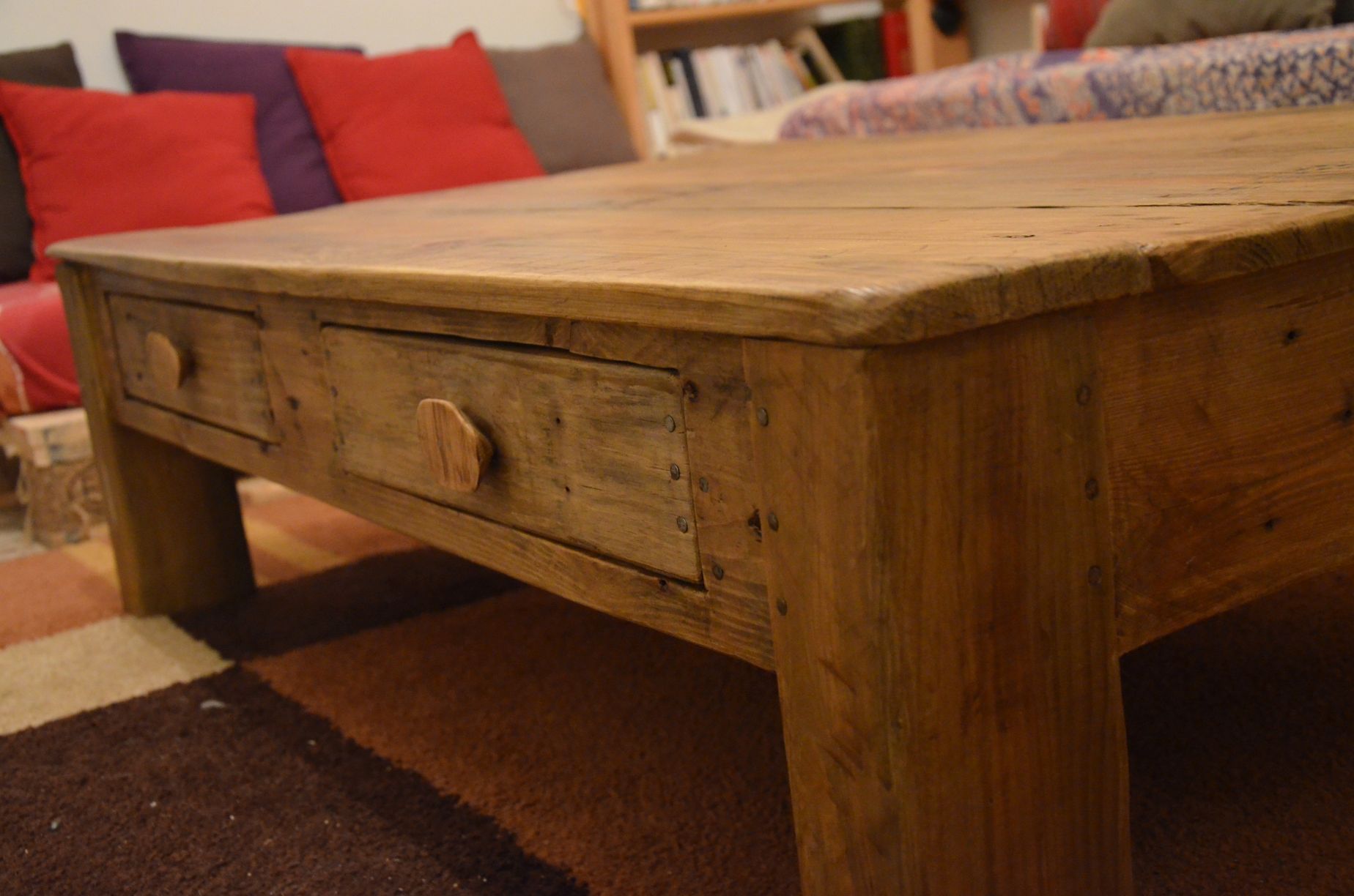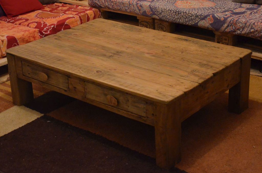 Table basse « Rustique », réalisé en bois de récupération, essentiellement du pin massif, très pratique avec ses quatre tiroirs.